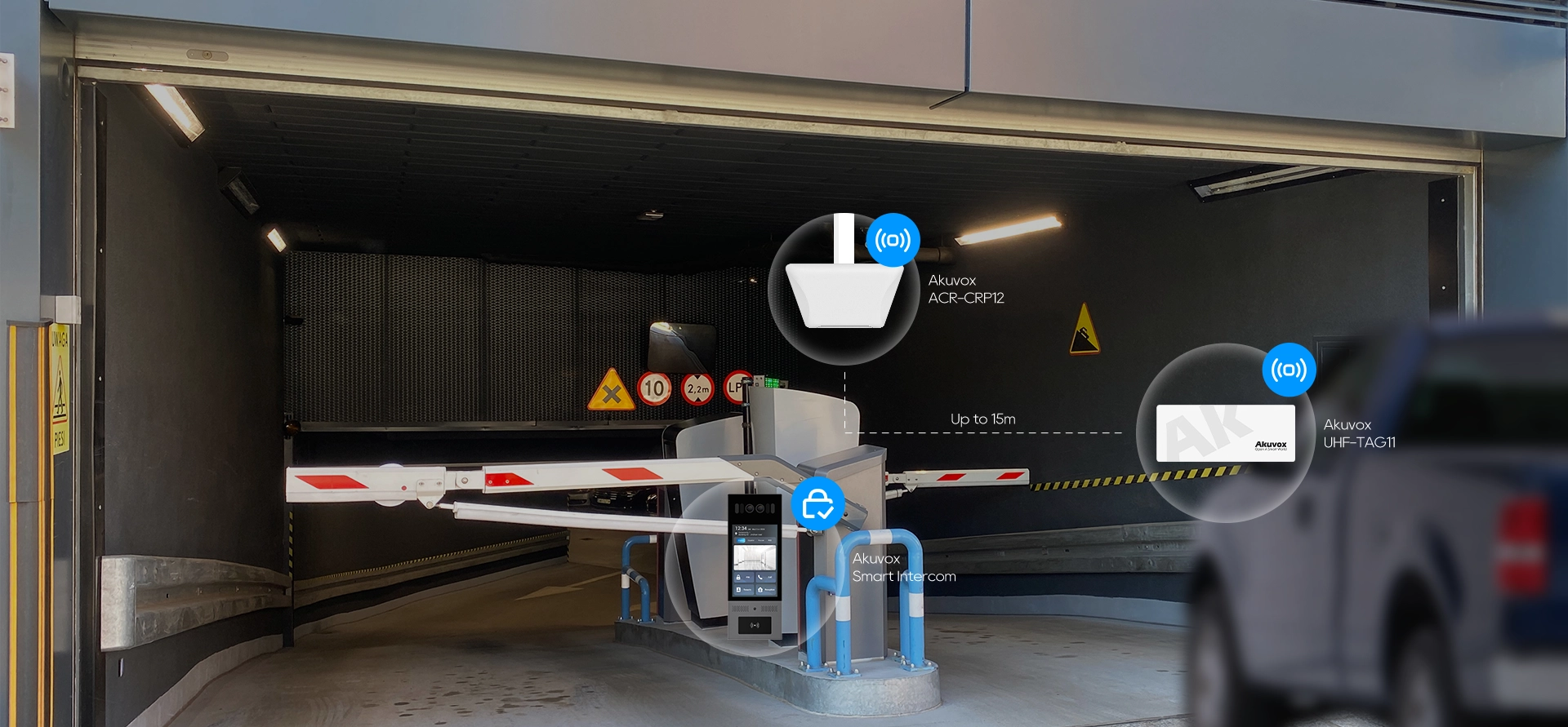 Když vozidlo vstoupí do snímací zóny čtečky Akuvox ACR-CRP12, karta Akuvox UHF-TAG11 uložená ve vozdidle je automaticky identifikována a informace z karty jsou přeneseny do interkomu Akuvox, který po ověření aktivuje otevření závory nebo garážových vrat.
